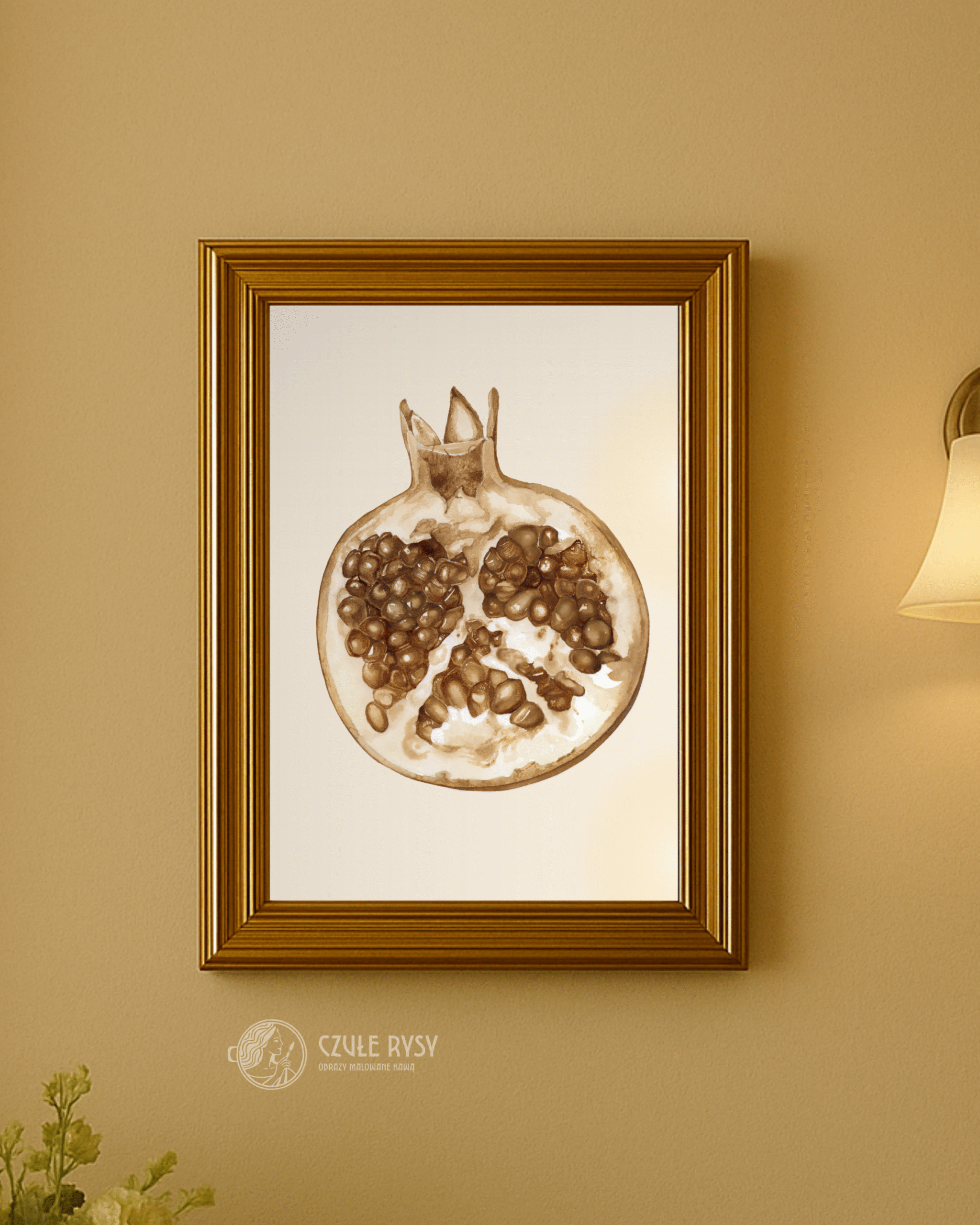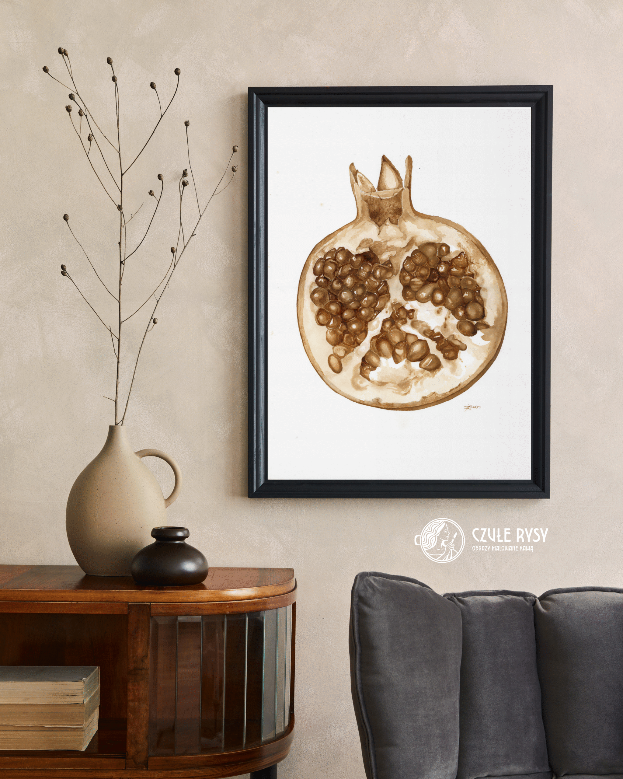 • Emocja: Granat. W języku polskim nazwa ta zgrabnie opisuje naturę tego owocu. Lekko kwaśnawy smak powoduje eksplozję ślinianek, już nie mówiąc o tryskającym soku przy próbie obrania! A granat malowany kawą, to nowy wymiar plakatu kuchennego. Jego wybuchowa natura i pobudzająca moc medium, którym został namalowany, stanowi połączenie idealne.