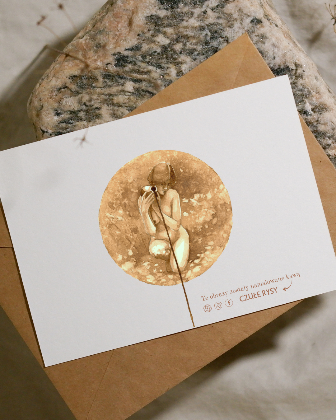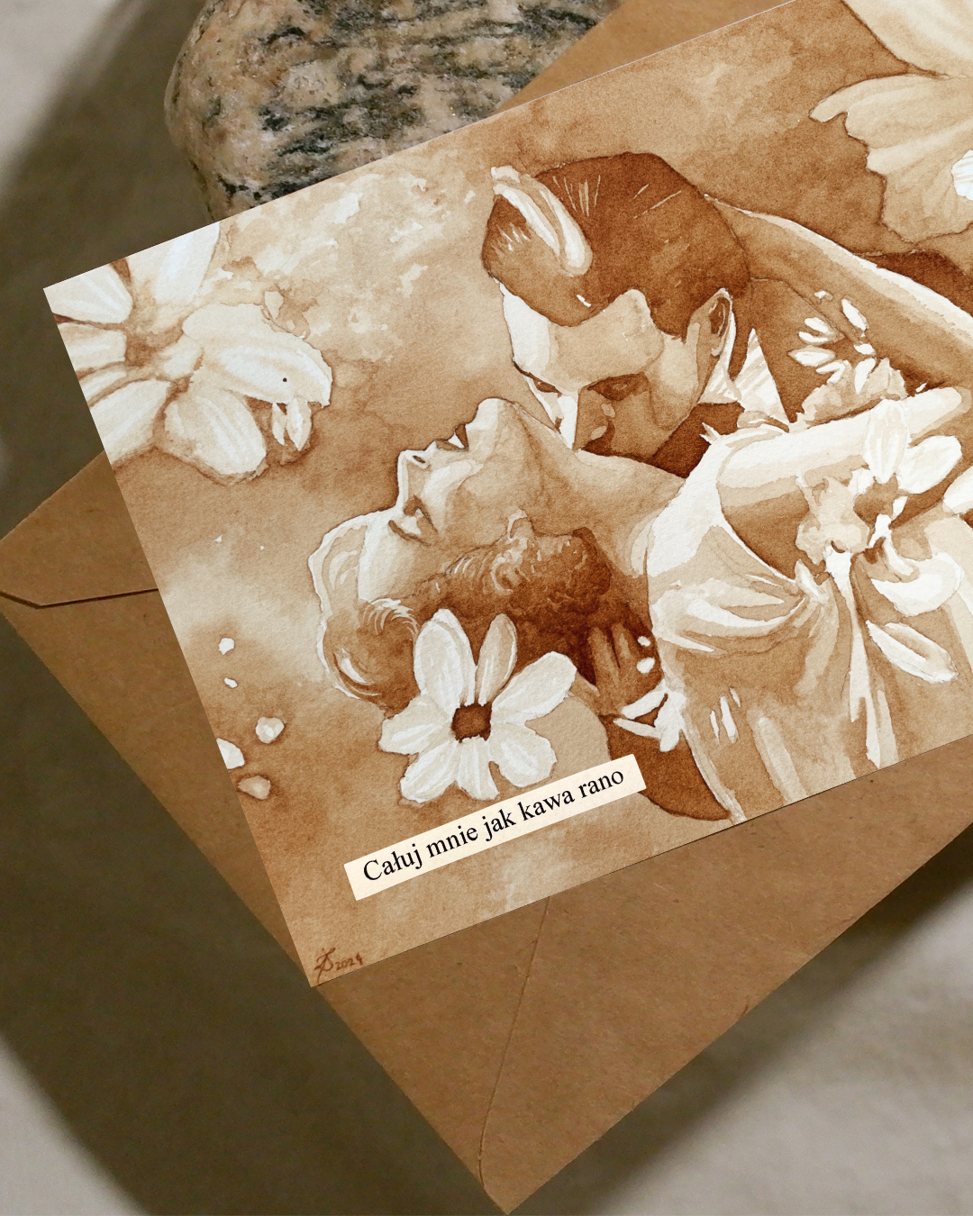 Kawową kartkę można (a nawet trzeba!) oprawić. Traktuje ona o miłości szaleńczej, płomiennej i niepoprawnej. Może być nie tylko mini obrazem i ozdobą we wnętrzach, ale przede wszystkim przypomnieniem o tym, by dać się dzisiaj komuś pocałować.