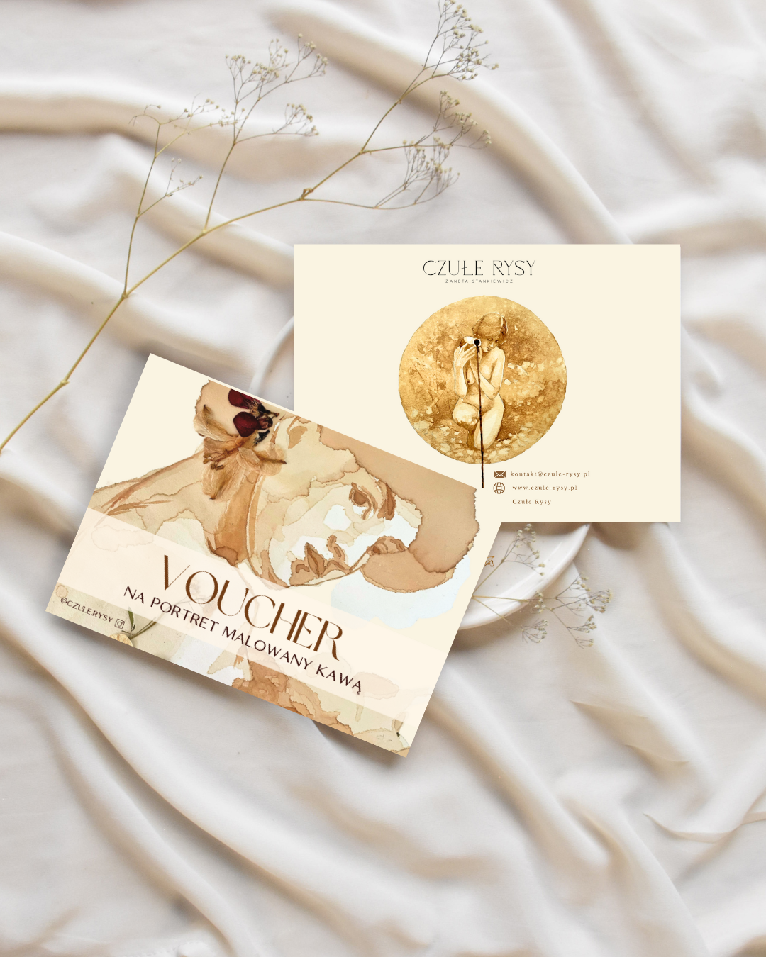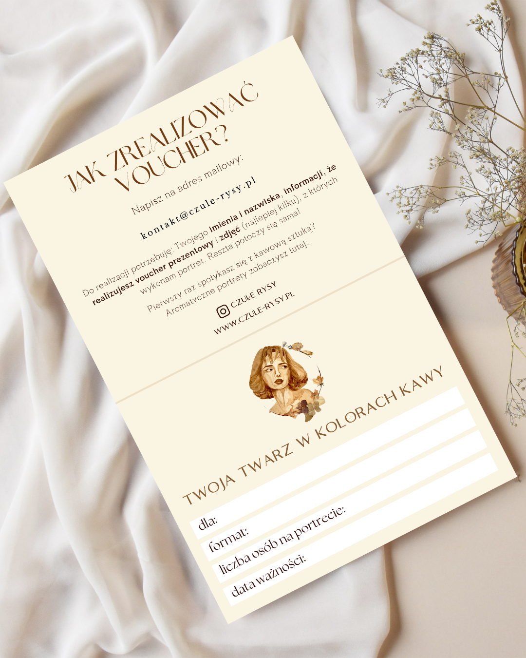 Obdarowany voucherem będzie miał okazję przeżyć przygodę od refleksji nad zadanymi mu pytaniami, przez otrzymanie szkicu wstępnego i emocji podczas oczekiwania na efekt końcowy, aż po odpakowanie przesyłki z własną twarzą ujętą w kawowe barwy. Obiecuję, że zadbam o Obdarowaną przez Ciebie osobę tak, by czuła się wyjątkowo i doświadczyła pięknych emocji.
